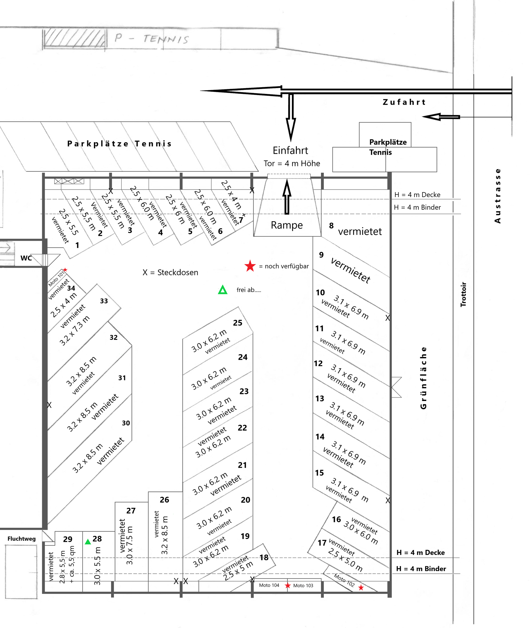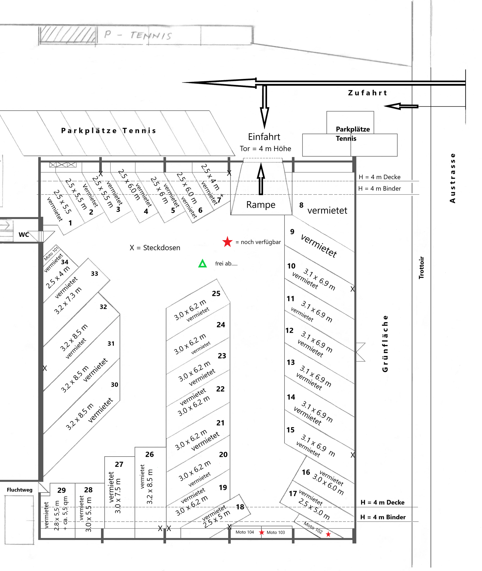 Verrechnungsfläche: entspricht meistens der Parkfläche. Einige Plätze verfügen über eine grösser Zusatzfläche für ein Motorrad oder ähnlich. Diese sind etwas teurer. Fragen Sie uns.